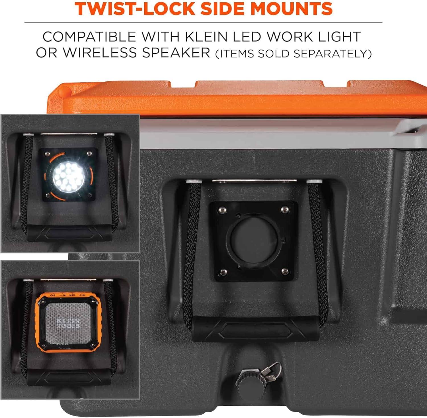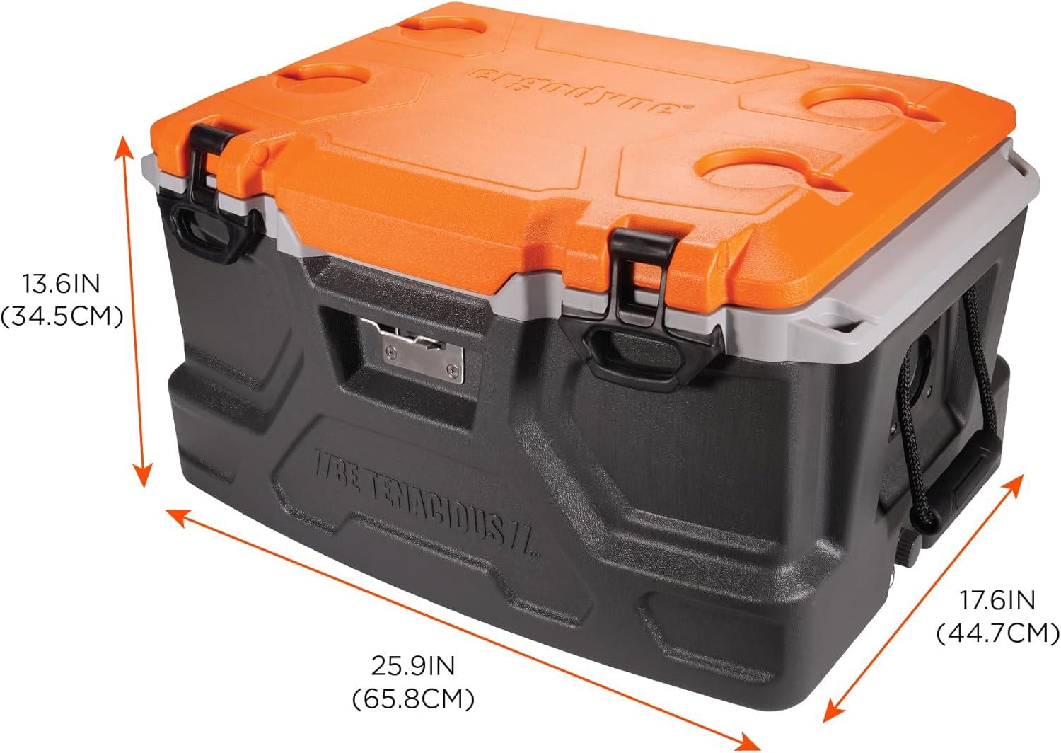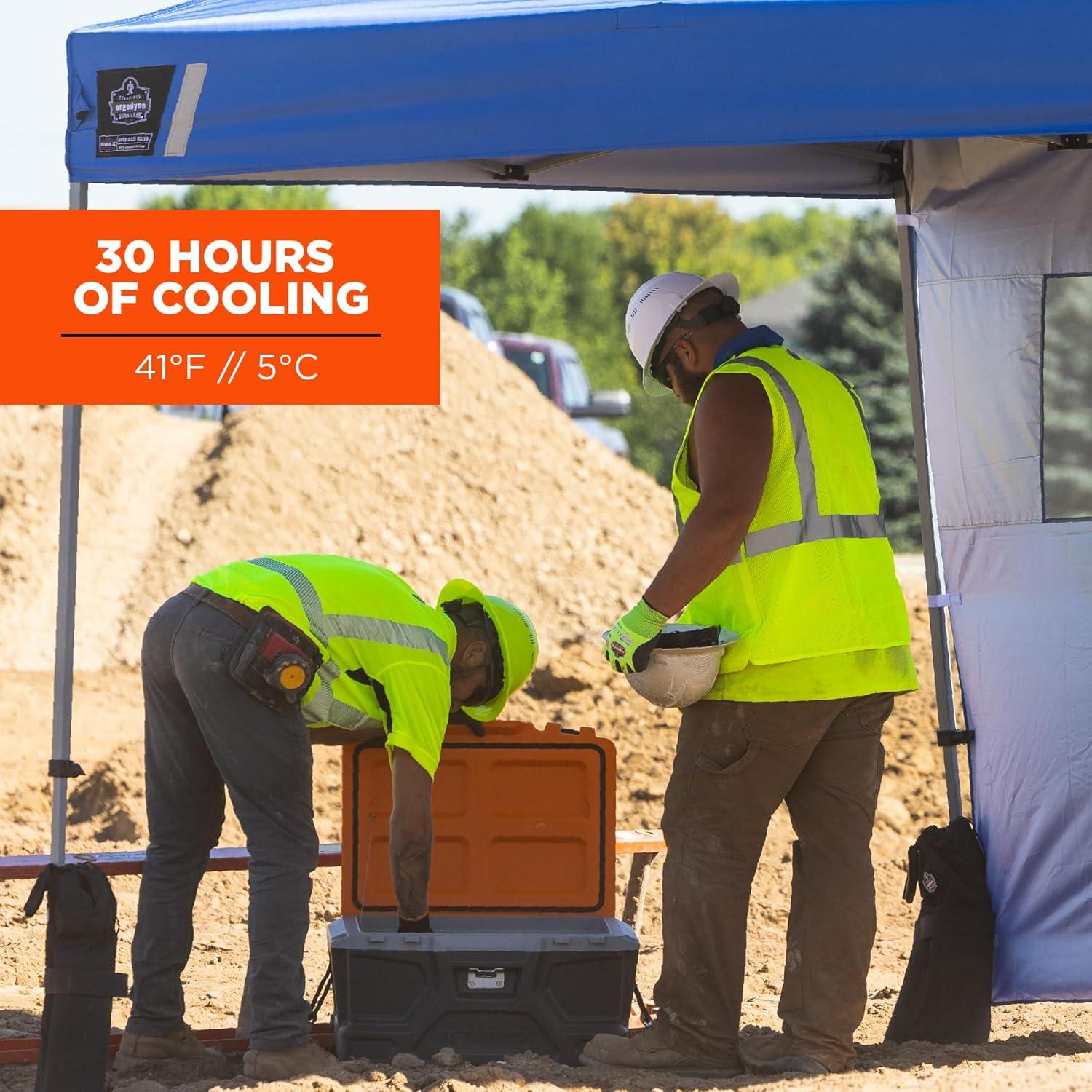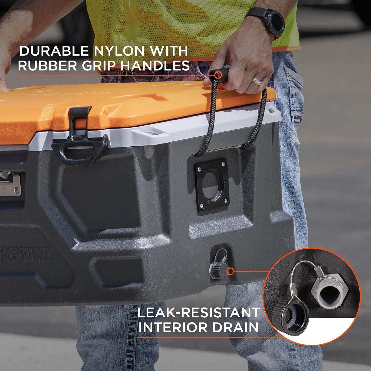 The Chill-Its 5170 Industrial Hard-Sided Cooler is a durable jobsite cooler that keeps food/drinks cold for up to 30 hours. This industrial cooler features a 17-quart (16.1 L) main compartment with polyurethane insulated foam, an interior compartment for personal items, an optional lock hasp to accommodate #1 Master Lock (sold separately), and a fabric handle/shoulder strap for carrying. This cooler can hold 18 cans and is tall enough to store 1-liter bottles. The hinged lid locks in place at 90 degrees or opens a full 180 degrees to access the interior compartment that can hold keys, utensils, napkins, etc. The lid is recessed to accommodate larger 1-liter water bottles. The hard-sided, rugged construction can also be used as an extra seat and will support up to 300 lbs. The fabric shoulder strap can be converted to a handle for easy transportation to the jobsite. This durable jobsite is perfect for those who are working in the heat, or in construction, maintenance or trades.