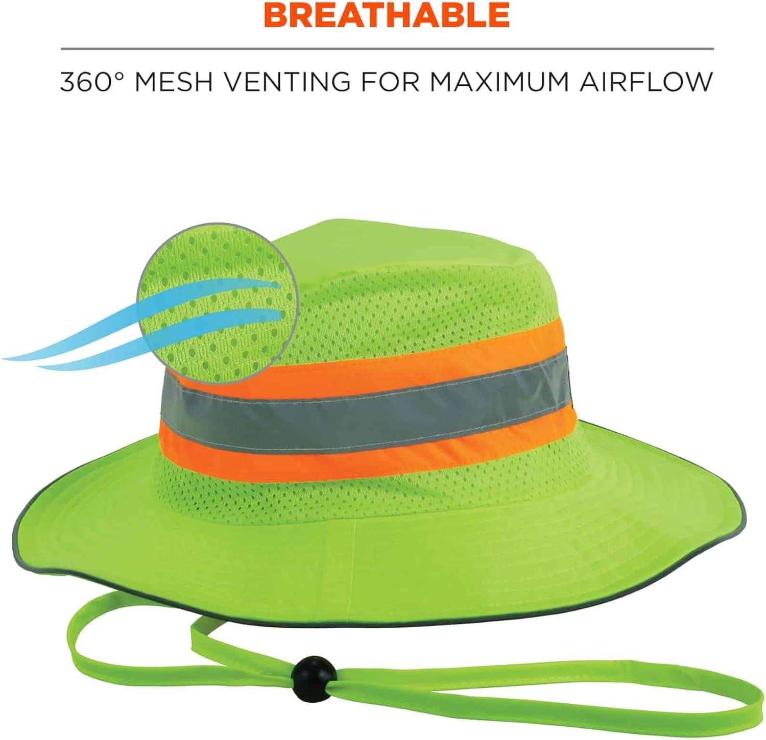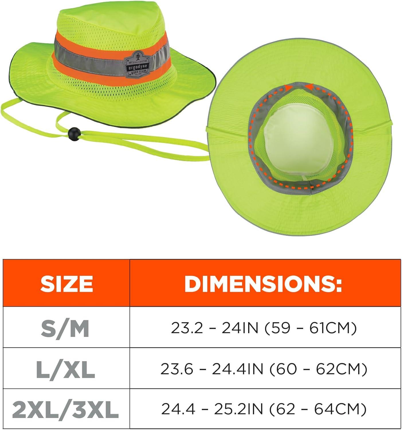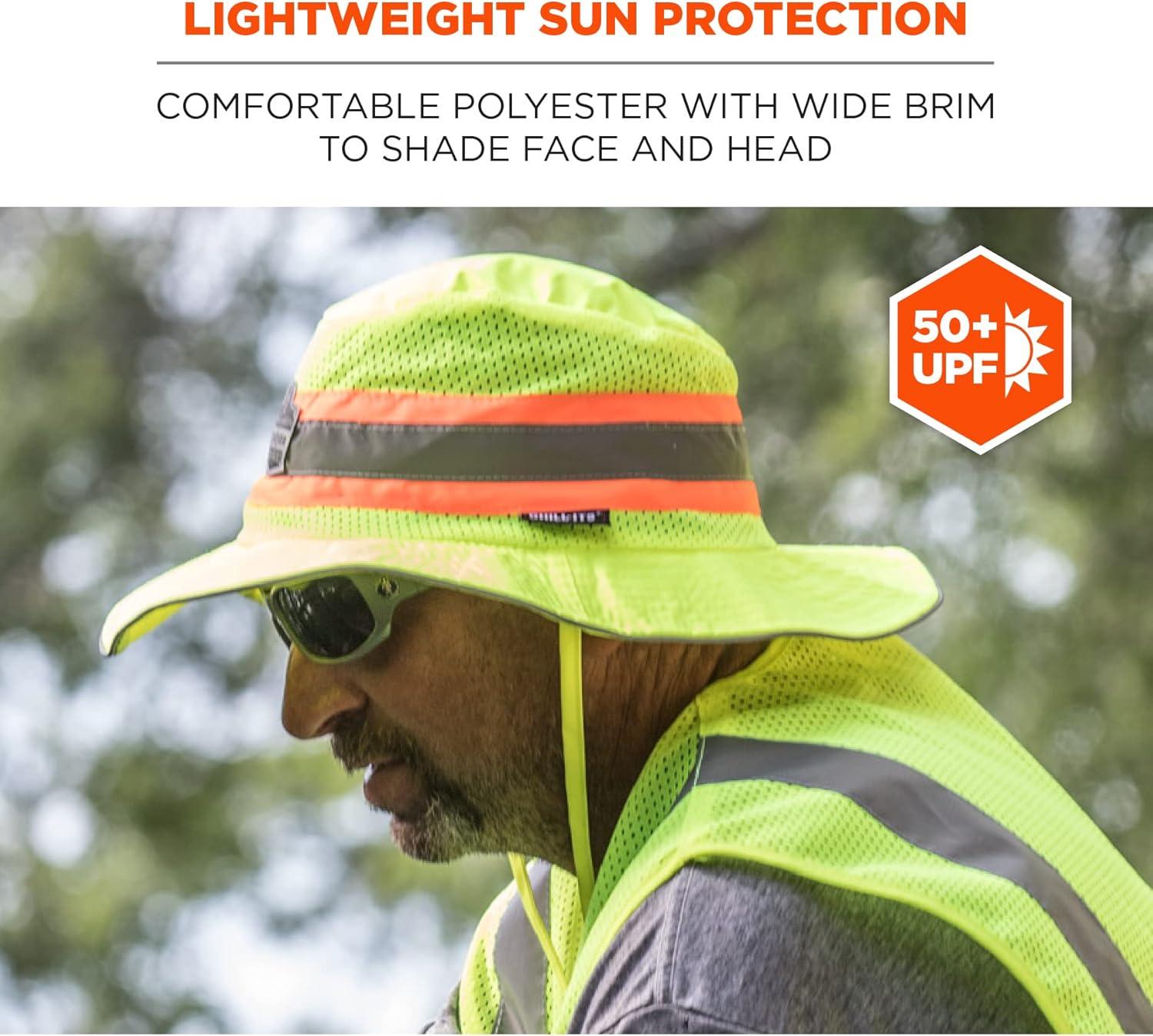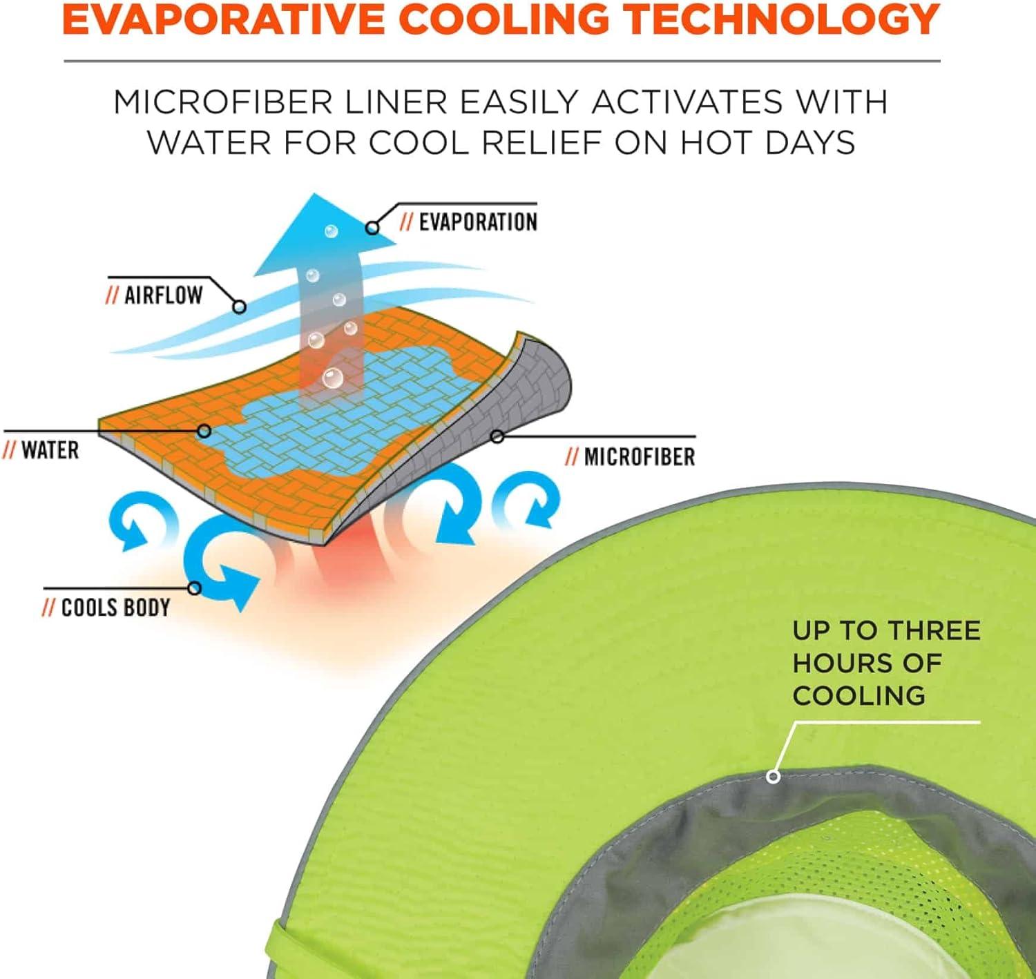 The Chill-Its 8935MF Hi-Vis Sun Hat is a lightweight and breathable sun protection hat with advanced microfiber cooling technology lining the rim for relief in extreme heat. This 150D polyester sun hat is rated to UPF 50+ and features a wide brim for complete face and head coverage, while 360-degree mesh venting maximizes airflow for breathable comfort. The hi-vis colors and 1in // 2.5cm reflective tape are ANSI 107 compliant to keep workers safe and seen. Evaporative cooling technologies such as microfiber are a simple, effective and comfortable solution for heat stress prevention. Evaporative technologies use an external water source to draw heat away helping to regulate body temperature while providing cool relief. HOW TO ACTIVATE Run the inside rim of the sun hat under water for one minute to activate instant cooling relief that lasts up to three hours. The ultra-absorbent microfiber will retain water while remaining soft and comfortable.
