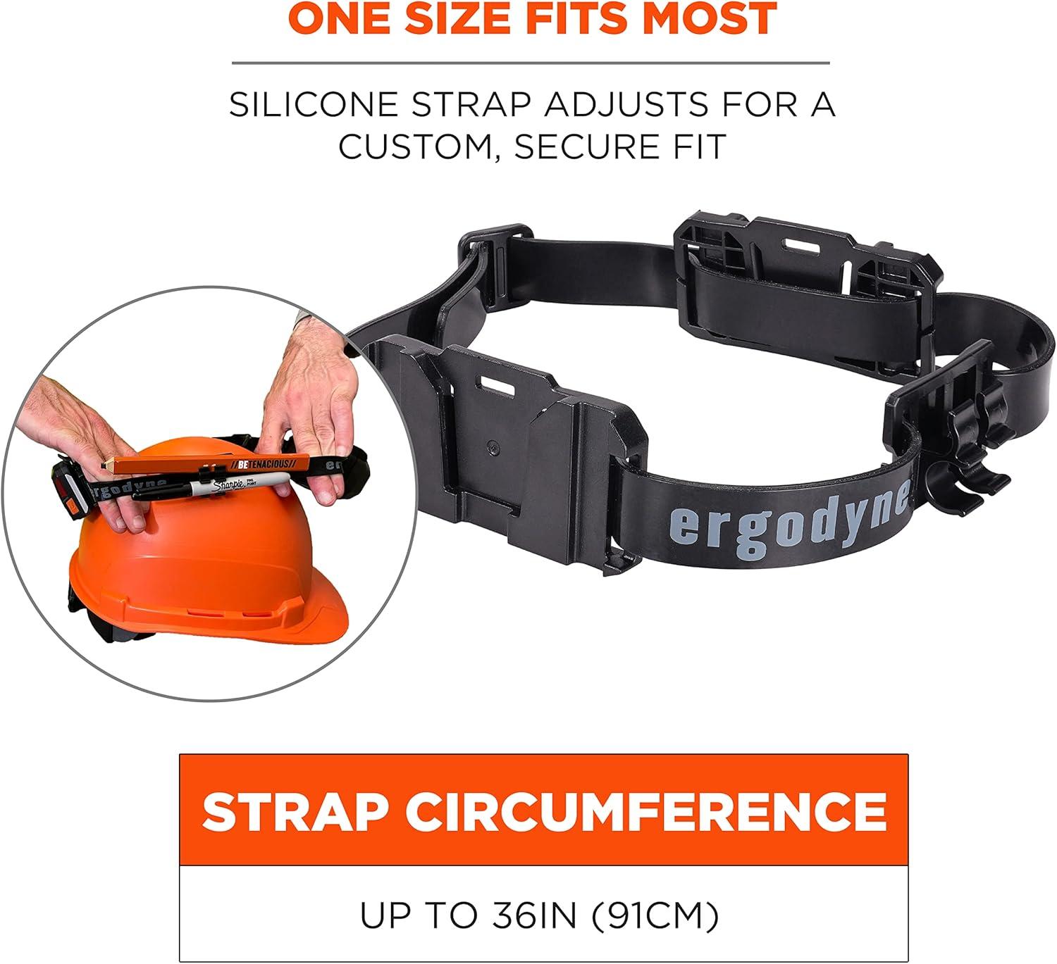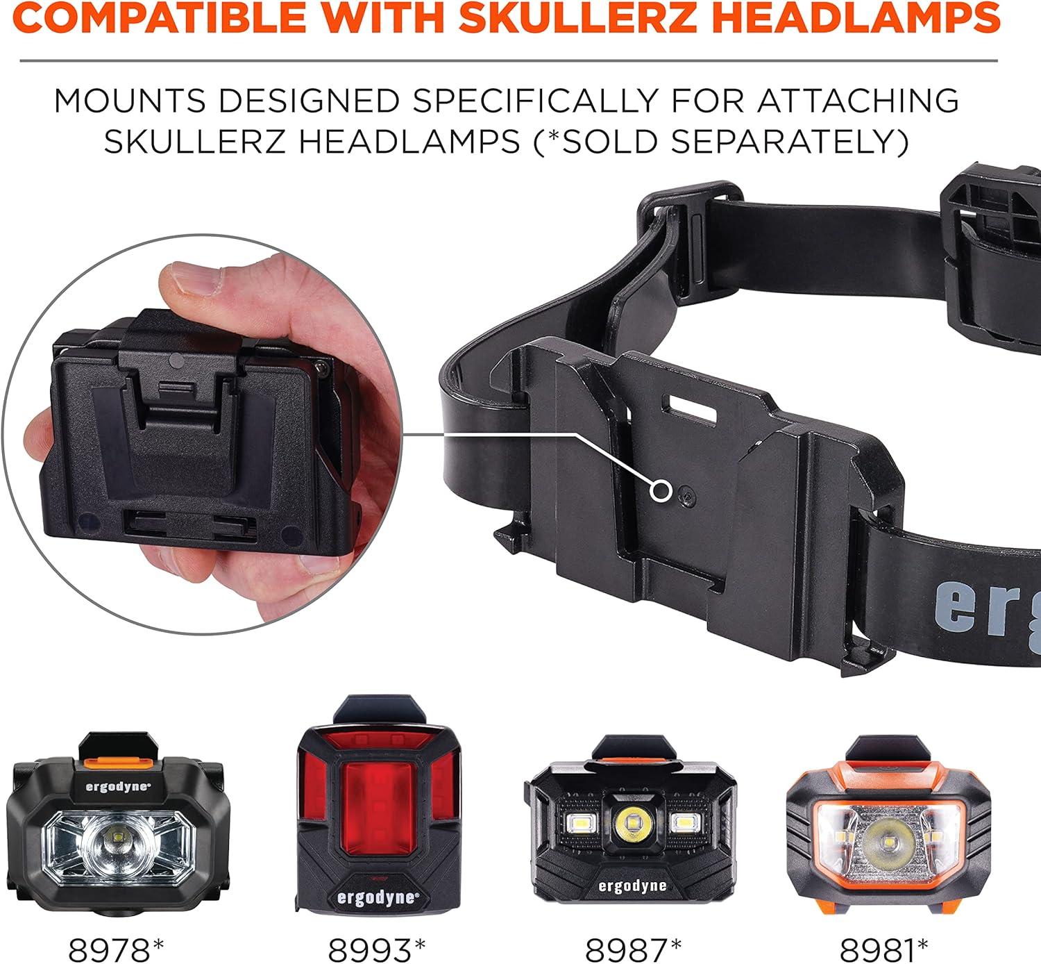 The 8979 Headband Light Mount with Silicone Strap works with all Skullerz Headlamps (8978, 8981, 8987, 8993) to provide hands-free lighting with hard hats, safety helmets or hard-shell bump caps. Made with rubberized silicone, this non-slip strap will not slide around on hard or smooth surfaces. This adjustable strap features 2 light mounts for front and rear lighting, and a bonus accessory mount for quick access to markers and carpenter pencils. All mounts are removable and can easily slide along the strap for adjustable use. One size fits most, the headlamp strap easily adjusts for a custom and secure fit. Hard hat lights and headlamps sold separately.