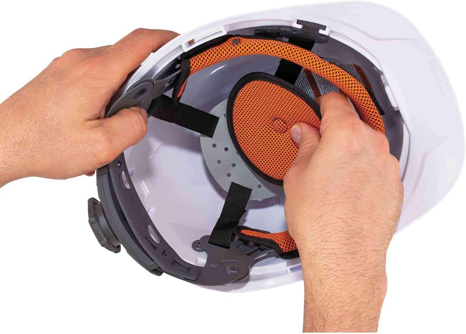 The Ergodyne Skullerz 8983 Hard Hat Replacement Top Pads (3-Pack). Integrated hook and loop on the top of the pad quickly attaches to the hard hat suspension. The padding is available in hi-vis orange and built with breathable, washable, and moisture-wicking material to help wick sweat away from the top of the wearers head to keep you cool and dry.